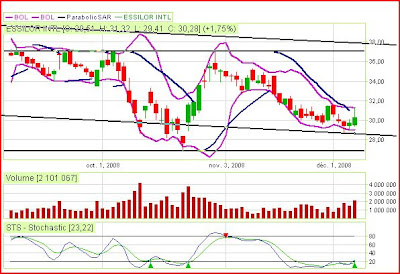Le graphique d'Essilor présente de nombreux signes de changement de cap, de retournement, le titre restant dans un canal baissier (le graphique affiché a un time frame de 3 mois). Premier indicateur, que j'utilise beaucoup, les stochastiques "lentes" indiquent clairement qu'une phase haussière est probable durant les jours à venir. Comme nous pouvons le constater sur la période récente, cet indicateur ne s'est pas trompé, il paraît alors assez fiable. Le Macd (non affiché) prépare son croisement haussier lui aussi. Les bandes de bollingers se resserent, et les paraboliques montrent la fin de la baisse. Les supports sont relativement proches, autour des 27.50 €. Tout ceci me porte à croire qu'il se pourrait que le titre bénéficie d'une amélioration des conditions de marché, et effectue ainsi un rebond vers les 33 €, puis 35 €, mais pour atteindre ce niveau, il faudra une nouvelle suffisament rassurante, et ça, ce n'est pas acquis d'avance. Petite déception concernant le dividende. Celui-ci est assez faible, un peu plus de 2 %, et ne constitue pas pour moi une incitation à l'achat. A noter que le PER reste élevé, ce qui illustre mes craintes de poursuite de la baisse au cas où les "bulls" échouaient. A noter également que le flottant du titre est considérable, il n'y a pas de très grand actionnaire, mis à part les salariés qui contrôlent environ 13 % du capital total. Essilor est donc considérée comme étant "opéable", mais dans les conditions présentes, qui voudrait procéder de la sorte? A part Warren Buffet bien entendu ;)