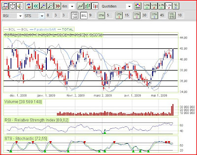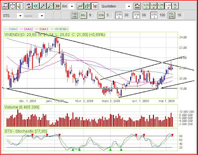 Je pense qu'il serait plus sage de liquider des positions ouvertes sur le titre. Et pouquoi pas passer bearish? Dans ce cas, stop loss à placer légèrment au-dessus du plus haut atteint la semaien dernière, c'est en tout cas ce que je fairais. En cas de retournement du marché, Veolia serait certainement en première ligne. Jettez un coup d'oeil à BNP également, point crucial.