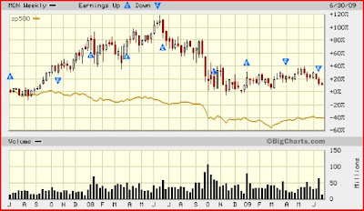 La principale cause à cette baisse des profits est la perte de contrôle du marché des herbicides avec le round-up qui doit affronter la montée en puissance de la concurrence. Les profits engendrés par la branche Round-Up sont anticipés en chute de 50 % de 50 % d'ici à 2012, passant de 2 à 1 Milliard $. Ceci devrait être compensé, et même bien plus que compensé, grâce à la forte croissance des ventes des produits autres que les herbicides, autrement dit les cultures génétiquement modifiées et les engrais -en plein boom, et synonyme de rendements et de productivité agricole croissants (et aussi d'une amélioration des productions agricoles, du moins en théorie!). Le titre a connu un plus haut à 145.80 en juin 2008 avant une descente aux enfers avec le reste du marché et de ses paires à l'instar de Mosaïc (NYSE:MOS)