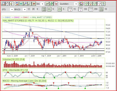 Jusqu'à présent, Wal Mart n'a pas souffert de la crise qui frappe le monde et les consommateurs américains, qui se sont dirigés vers le groupe en abaissant leurs standards de consommation. Et Wal Mart fait figure d'exception car la plupart de ses concurrent ont beaucoup souffert. Ceci se voit clairement dans les cours, Wal Mart évoluant à ses niveau de 2007 après avoir largement progressé en 2008, à contre-courant. Dans le même temps, le dividende a été augmenté de 15 %, même s'il n'est pas exceptionnel pour une entreprise de cette taille: 1.09 $ cette année contre 0.95 % l'an dernier, soit à peine plus de 2 % de rendement HT. De plus un nouveau plan de rachat d'action à été lancé, de même ampleur que le précédent (15 milliards $). La publication devrait confirmer la baisse des coûts dans l'alimentation et l'énergie, se traduisant également par une baisse des ventes à périmètre comparable (comme les chiffres de la concurrence le suggèrent pour le mois de juillet), ce que certains analystes redoutent. Finalement Wal Mart aussi souffrirait...