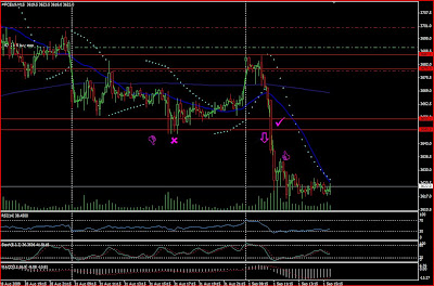 Hier j'ia diffusé mon opinion: vente si cassage du bas du range, achat si cassage du haut. Le FCE a tenté de passer par le bas, mon premier ordre s'est déclenché, mais le second aussi, à un tick près, au plus mauvais prix possible à vrai dire. De ce fait, après exécution d'un stop loss et d'un take profit, j'ai réalisé une perte de 6 points. Négligeable, mais décevant, très décevant. Ce matin, rebelotte, sauf que cette fois le marché a bel et bien plongé au sortir du trading range (plonger est un terme quelque peu exagéré il est vrai, mais il faut dire que depuis un certain temps, avoir des variations de plus de 1 % de hausse ou de baisse est devenu assez rare).