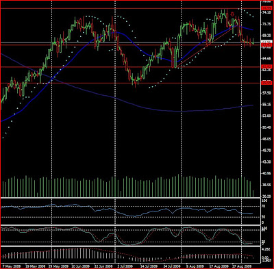 Premier chart en 15 mn. En rouge, un de mes niveau de support clé que l'on retrouve sur le chart daily qui vient ensuite. En bleu, deux lignes horizontales qui matérialisent des points d'entrée éventuels. Buy Stop Order à 69.55 (dans la mesure où le franchissement est net, marqué), avec un test probable des 70 $ à la clé, mais prendre 45 cents sur le pétrole ce n'est déjà pas rien. Ceci pourrait rouvrir la voie des 75 $ qui résistent encore. Ensuite, Sell Stop Order à 66.95 $, là encore à n'éxécuter que si le franchissement à la baisse est bien marqué, sans quoi il vaudra mieux se résigner à regarder l'action se dérouler (je ne suis pas très à l'aise avec ce point d'entrée, mais je m'efforce de ne pas manquer le futur mouvement de grande ampleur...)