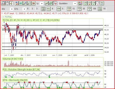 En lien avec mes avis sur l'or noir, voici Total (FP), dans une configuration intéressante une nouvelle fois. Le titre atteint des niveaux clé, c'est à dire le haut du trading range, valide depuis déjà un an. On peut voir qu'en cas de hausse des cours du brut, Total pourrait casser à la hausse ce range et monter assez haut. Mais l'inverse est entièrement possible, et on devrait dans ce cas de figure retrouver Total à 39 €, voire plus bas si le baril est en petite forme.