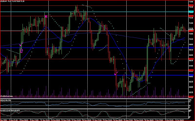 -Premièrement, le fait de se situer au-dessus des 70 $ est plutôt positif pour le pétrole, il pourrait continuer son mouvement de reprise amorcé, avec un franchissement du plus haut intraday en force, c'est à dire franchissement des 70.75 $. Si nouvelle positive pour le pétrole, hausse probable jusqu'à 71.95 dans un premier temps, puis 72.50. Mais je ne compte pas me placer à ce prix là, sauf si l'opportunité crève les yeux, pas assez d'éléments je trouve... En bref, une hausse au-delà des 70.75 pourrait mener l'or noir tout droit vers les 71.95 puis 72.50 $, niveau constituant une résistance assez importante. Ensuite on aurait 72.90, 73.50 $ surtout, et 75 $. D'ailleurs si ce dernier niveau était franchi à l'avenir, avec volumes en soutien, on pourrait tenter un trade du même type que celui réalisé par ceux qui ont acheté en masse lors du franchissement de résistance de l'or jaune.