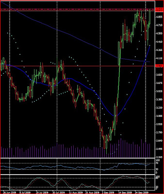 Voici le chart en daily des futures à échéance Novembre du gaz naturel (NGX9). On voit bien que la chute irrationnelle de la fi nde semaine dernière a laissé palce...à une hausse quasi irrationnelle elle aussi. On s'approche énormément de la barre symbolique des 5 $, qui a même été touchée plus tôt dans la séance. Franchissement à venir? Nous sommes déjà en fin de journée, et à l'approche de cette zone on sent de la pression. Mais si les acheteurs en ont la force, le Gaz Naturel franchira sa résistance symbolique, psychologique et graphique des 5 $.