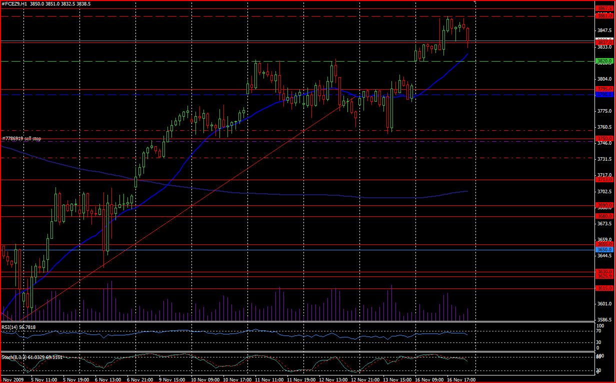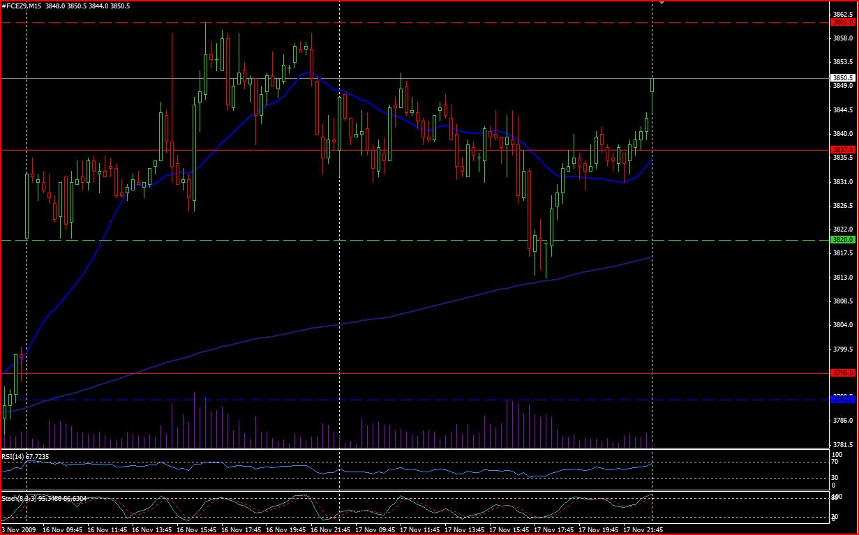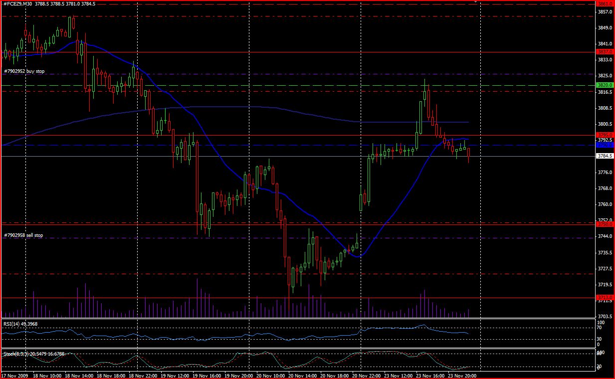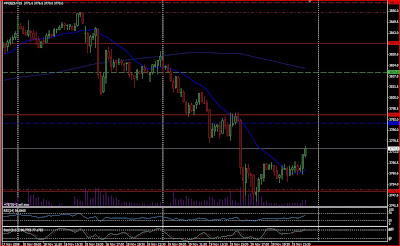 Ma grande satisfaction du jour provient du CAC40, des Futures FCEZ9. La sortie du trading range, tant attendue, a eu lieu, par le bas, le scénario que je privilégiait. J'avais deux ordres, un premier à 3763 points, pour exploiter au maximum un potentiel baissier, cellui-ci a été largement gagnant, je vous laisse jetter un coup d'oeil à ce graphique. Mon target était à 3715 points (support des 3713). Mon second ordre a été éxécuté, automatiquement également, à 3740, mais j'avais malheureusement un Stop Loss à 3751 points, qui a été touché, au pip près...Je suis donc le dindon de la farce en quelque sorte.