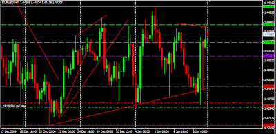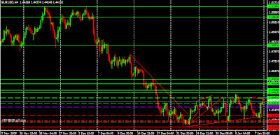 Voici un premier chart afin de donner un bon aperçu, n'hésitez pas à l'agrandir. Je vais essayer d'incorporer un code HTML prochainement permettant d'ouvrir le chart dans un autre onglet mais je suis un peu débordé ce soir... Après la chute de décembre, EUR/USD évolue dans un mouchoir de poche. A chaque fois que la paire s'approche des 1.4450-1.4483, les haussiers cèdent et la paire retourne vers le bas du range c'est à dire vers 1.4260-1.4300.