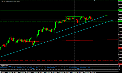 Le CAC40 désormais. Alors que j'étais en train d'écrire, les marchés ont connu un léger accès baissier, sans doute à cause de débouclages de position par prudence. sinon, il s'agit de fuites... Le CAC se trouve dans un canal haussier court terme, ou plutot très court terme. Je ne compte pas me positionner long sur l'indice parisien (je dis le CAC pour simplifier, je rappelle qu'il s'agit ici des futures [échéance mars]) avant un éventuel dépassement de la ligne verte claire, vers 3831-3833 points. De là, on pourra viser un rebond vers 3850 points, voire plus haut vers 3880 points, mais j'en doute...