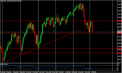 JC Trichet n'a pas convaincu quant à la solidité de la Grèce, et les inquiétudes continuent de peser sur la monnaie unique (les taux restent stables à 1 %, comme prévu). Quid du Portugal, de l'Espagne, que j'ai souvent cité depuis 2 mois? Mais pour l'Euro, cette chute n'est pas une surprise, voici déjà longtemps que j'annonce cette correction, d'autant plus que la trendline haussière très court terme qui s'était mise en place en début de semaine n'a été d'aucun soutien hier... La question sera désormais d'estimer quand cette chute prendra fin. En tout cas, elle ne déplaît pas à notre chère ministre des finance, qui se félicite d'un euro faible car il profite aux exportateurs.