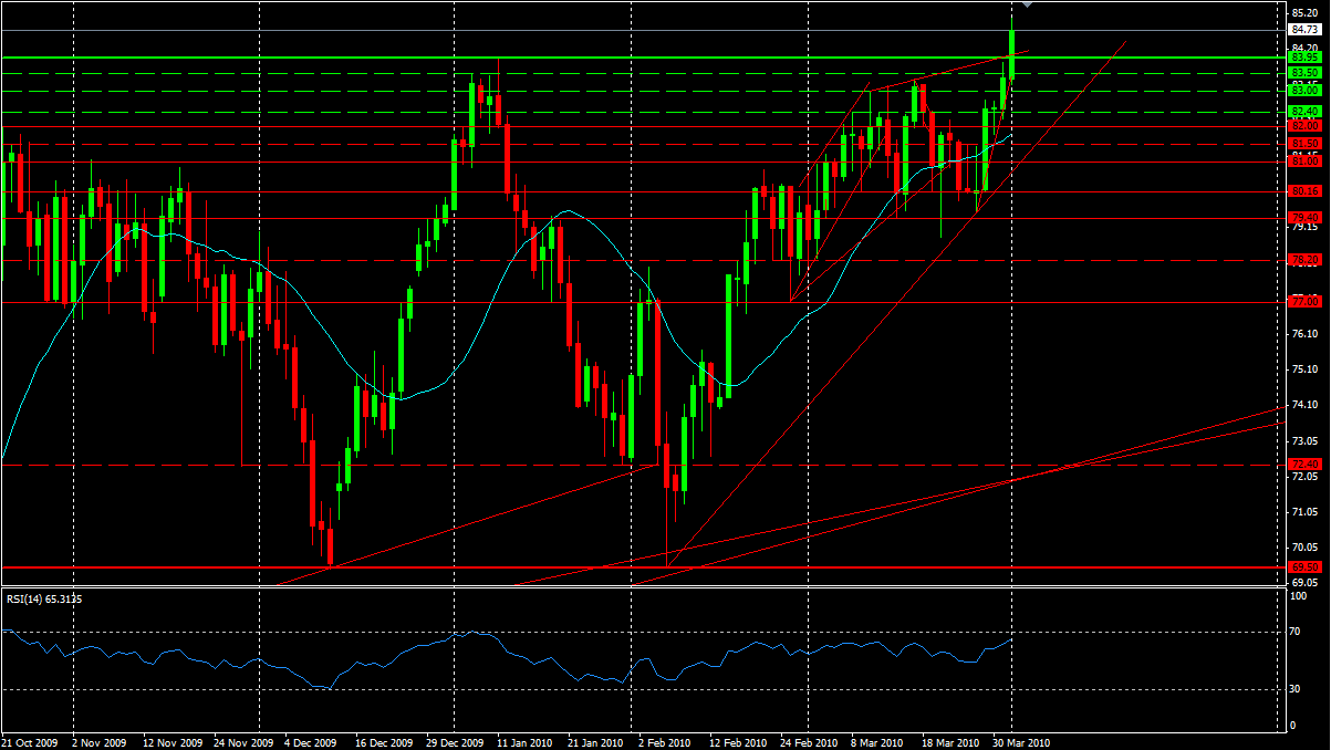 En bref, préférence haussière tant que les cours demeurent sur les 84.50 $, avec les 85.50 en ligne de mire, et très certainement plus (86, 87, 87.50).