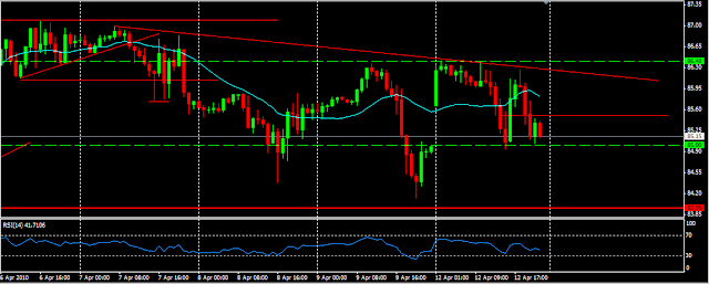 A la baisse, attention à un retour sur le plus bas intraday des 84.07 $ le baril. En fait c'est la zone comprise entre 83.95 et 84.10 qui attire mon attention. Elle est susceptible de soutenir les cours, mais en cas de rupture je pense que la situation deviendrait baissière, avec une nouvelle vague envisageable (je vous invite à regarder le chart en daily). Si 83.95 brisé, viser 83.40-83.50 voire 83.00 rapidement (mais dans l'idéal pas overnight)
