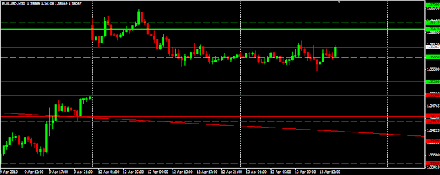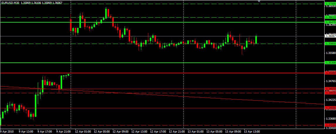 En cas de passage sous le plus bas intraday des 1.3555, nous pourrions avoir une occasion de passer short, il se peut que de ombreux ordres attendent sous ce niveau. Mais le S1 du jour ne serait pas très éloigné... Beaucoup de points de soutien possibles se situent entre 1.35 et 1.3555 ce qui fait que je n'ai pas d'ordre short programmé, du moins pas à l'heure actuelle.