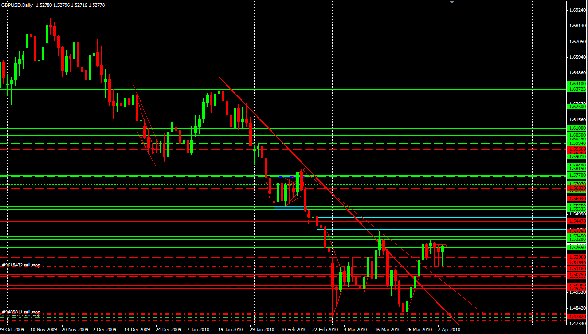 Mais tout d'abord voici un aperçu en daily, essayez simplement d'ignorer tous mes supports/résistances, le chart commence à devenir un peu fouilli en vue éloignée... Pour moi, GBP/USD est en train de sortir de sa tendance baissière et de tenter une consolidation, avant la mise en place d'un mouvement ample, peut-être au moment des élections dont le résultat demeure particulièrement incertain. Mais actuellement, je ne puis plus afficher mon opinion Bear tout schuss, je dois envisager plus sérieusement l'éventualité d'une reprise haussière, plus ou moins durable bien entendu. Mais véritablement, l'outcome des élections me semble être la clé du problème. En cas d'absence de majorité au parlement, la pression baissière devrait reprendre, je dis bien devrait, car cette possibilité est déjà assez bien pricée dans les cours, du moins selon moi. En cas de majorité assez large et de mise au travail immédiate pour réduire le déficit budgétaire sans mettre en péril le rebond de l'activité britannique, pourquoi pas assister à une certaine reprise de la livre sterling? Bien entendu, il faudra aussi considérer les développements US en terme de taux, de croissance et d'emploi (et de déficit?).