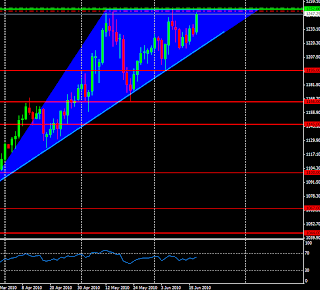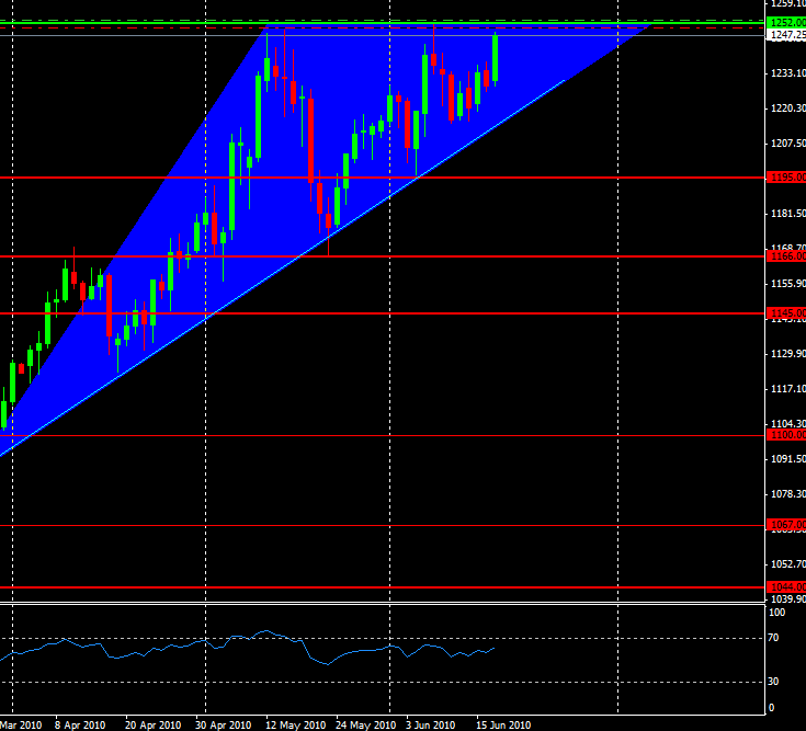 Les marchés sont encore assez frileux, mais se sont tout de même largement repris depuis mon dernier article sur le CAC40. Les craintes concernant les possibles failletes d'Etat persistent, mais tendent à s'apaiser tout particulièrement en Espagne, sans que les ennuis ne soient pour autant résolus. Mais l'or reprend son mouvement haussier et s'échange actuellement à 1245 $ l'once, tout proche de son record historique. Les acheteurs hésitent à aller plus haut encore, mais la pression est toujours perceptible.