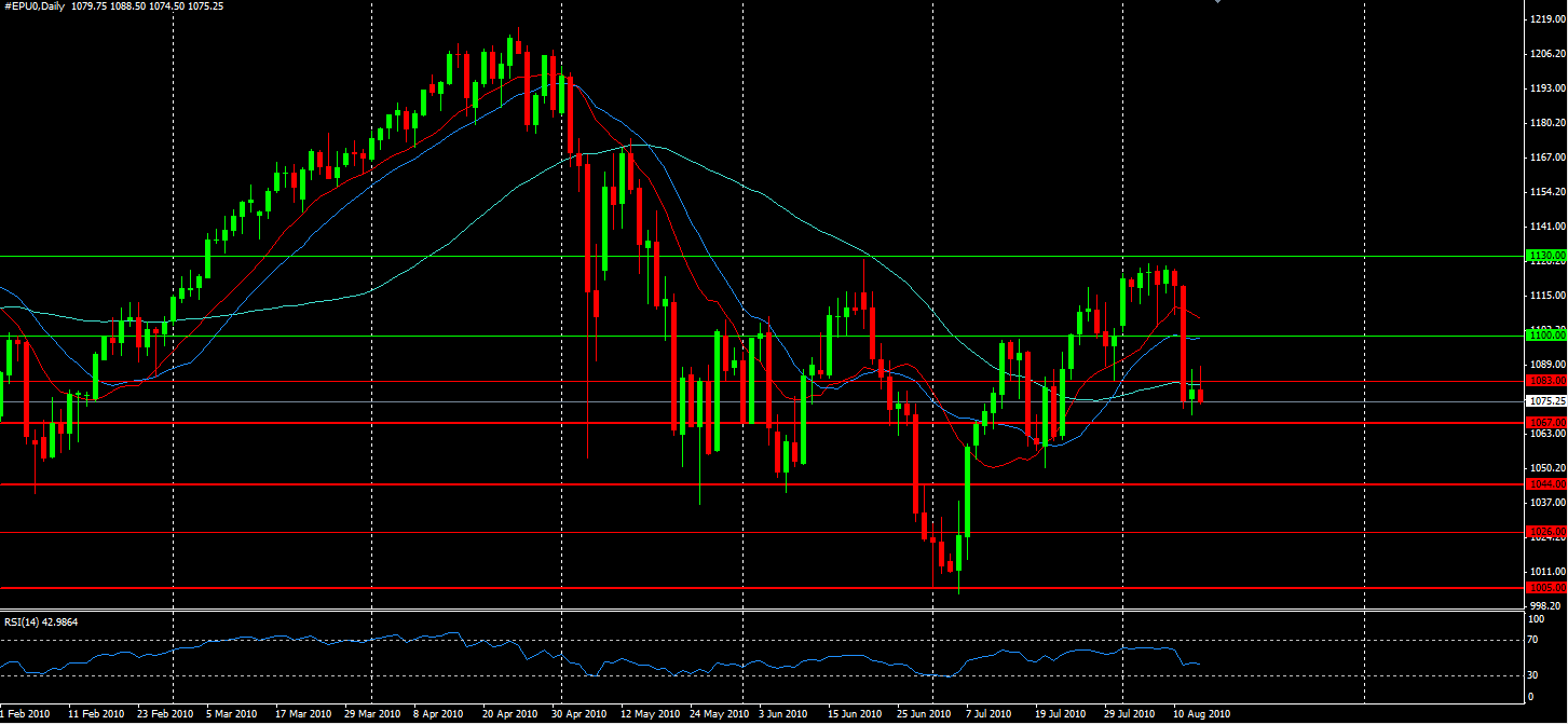 Les Futures S&P500 se trouvent au sein d'un canal baissier. Tout en haut du graphique vous pouvez voir la résistance des 1129-1130 points, une zone difficilement franchissable. De toute façon, nous en sommes loin, il faudrait un rebond de plus de 8.5 % à partir des niveaux actuels pour se retrouver sur les 1030.