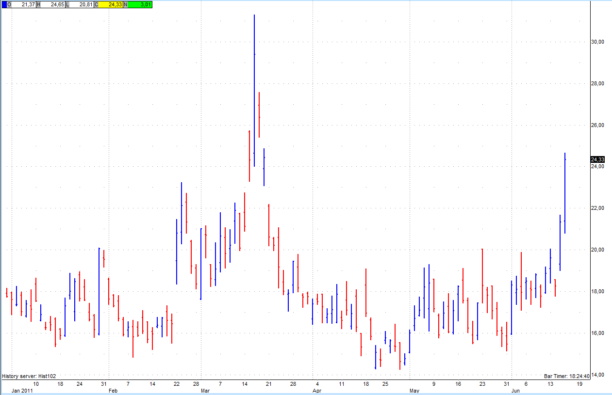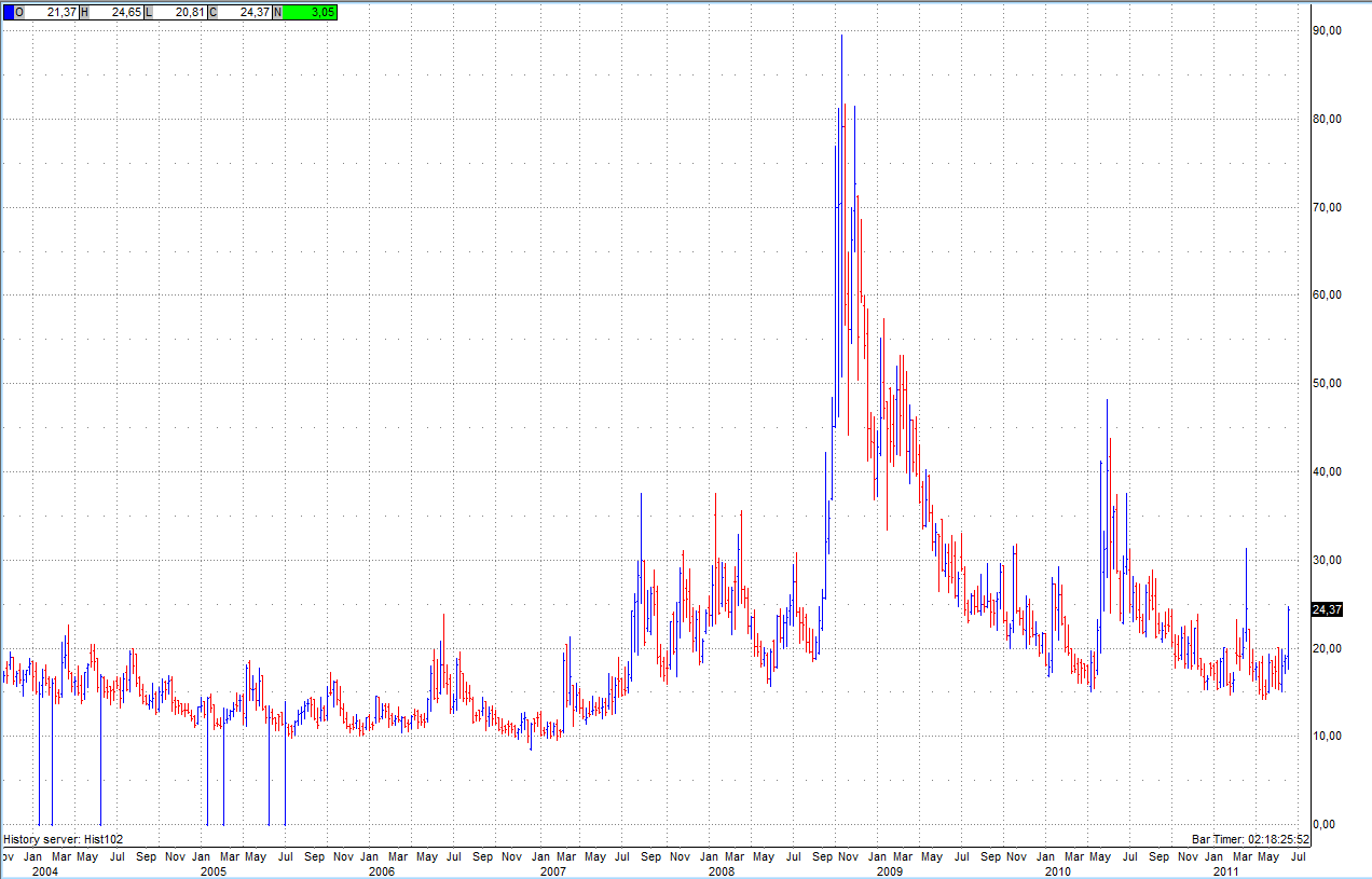 Le VIX, l'indicateur de volatilité privilégié semble finalement sortir de sa torpeur. Le VIX devrait figurer sous les yeux de tous les intervenants, comme le fait l'excellent Tom Keene sur Bloomberg tous les jours à 18 heures CET. Voici le graphique du VIX sur l'année 2011, vous remarquerez le pic causé par la panique liée au tsunami du mois de mars et tout ce qui en découle. Hormis cet évènement, le VIX se trouve à son plus haut niveau de 2011 au-dessus de 20.
