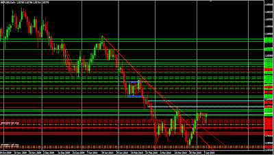 Mais tout d'abord voici un aperçu en daily, essayez simplement d'ignorer tous mes supports/résistances, le chart commence à devenir un peu fouilli en vue éloignée... Pour moi, GBP/USD est en train de sortir de sa tendance baissière et de tenter une consolidation, avant la mise en place d'un mouvement ample, peut-être au moment des élections dont le résultat demeure particulièrement incertain. Mais actuellement, je ne puis plus afficher mon opinion Bear tout schuss, je dois envisager plus sérieusement l'éventualité d'une reprise haussière, plus ou moins durable bien entendu. Mais véritablement, l'outcome des élections me semble être la clé du problème. En cas d'absence de majorité au parlement, la pression baissière devrait reprendre, je dis bien devrait, car cette possibilité est déjà assez bien pricée dans les cours, du moins selon moi. En cas de majorité assez large et de mise au travail immédiate pour réduire le déficit budgétaire sans mettre en péril le rebond de l'activité britannique, pourquoi pas assister à une certaine reprise de la livre sterling? Bien entendu, il faudra aussi considérer les développements US en terme de taux, de croissance et d'emploi (et de déficit?).