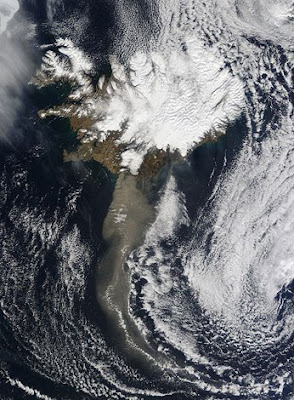 Voici deux très belles images satellite (toujours issues de e-quotes) datant du 19 avril du panache de fumée émis par le volcain Eyjafjöll. A noter que les vols reprennent effectivement un peu partout en Europe, y compris au Royaume-Uni, du moins dans sa partie septentrionale.